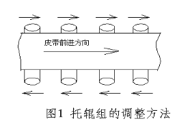 皮帶機的皮帶在整個皮帶運輸機的中部跑偏時可調(diào)整托輥組的位置來調(diào)整跑偏;在制造時托輥組的兩側(cè)安裝孔都加工成長孔,以便進行調(diào)整。具體調(diào)整方法見圖1 具體方法是皮帶偏向哪一側(cè),托輥組的哪一側(cè)朝皮帶前進方向前移,或另外一側(cè)后移。如圖1所示皮帶向上方向跑偏則托輥組的下位處應當向左移動,托輥組的上位處向右移動。