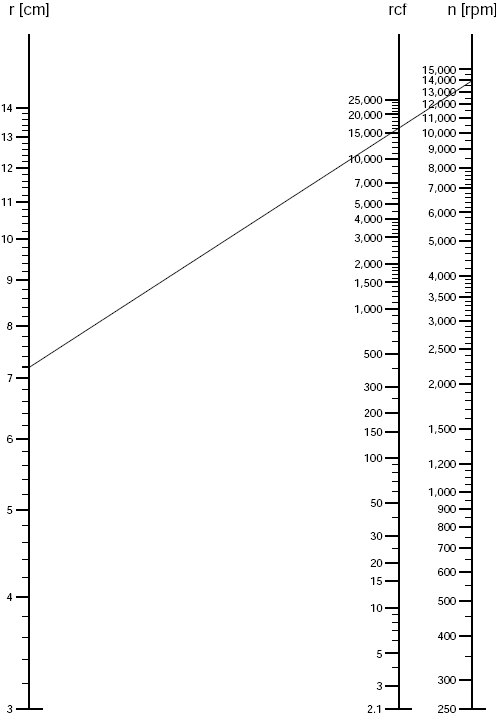 在有關離心機的實驗中,標準的指示樣本離心條件應該是用RCF(relative centrifugal field)來衡量, 而在實際大家實驗過程中, 往往習慣用rmp即每分鐘轉速來表示. 為了更好的對二者進行換算,特總結下文. RCF即表示相對離心場,以重力加速度g(980.66cm/s2)的倍數(shù)來表示;rpm(revolution per minute,或r/min)表示離心機每分鐘的轉數(shù)。 rmp與g之間的換算公式為: RCF = 1.119× 10-5 × (rpm)2 × r 其中r 表示離心機轉軸中心與離心管中心的距離(如下圖所示),單位為cm。由于離心管的位置由轉子(rotor)決定,因此r 必須由查閱相關轉子的參數(shù)而得。 ![]() RCF 與rmp 的換算也可以經(jīng)由下表直接讀出,方法是在下圖標尺上取已知的r 半徑值和在RCF 標尺上取已知相對離心力值,這兩點間線的沿長線在rpm標尺的交點即為所要換算的值。反之亦然。 ![]() |