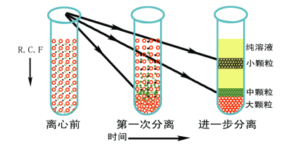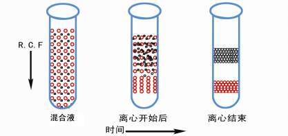 當(dāng)不同顆粒存在浮力密度差時(shí),在離心力場下,顆粒或向下沉降,或向上浮起,一直沿梯度移動到它們密度恰好相等的位置上(即等密度點(diǎn))形成區(qū)帶,稱為等密度區(qū)帶離心法。等密度區(qū)帶離心的有效分離取決于顆粒的浮力密度差,密度差越大,分離效果越好,與顆粒的大小和形狀無關(guān),但后兩者決定著達(dá)到平衡的速率、時(shí)間和區(qū)帶的寬度。
