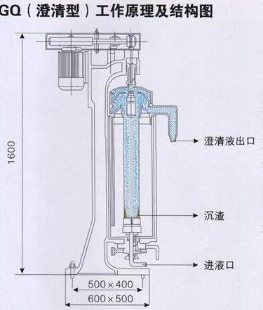 工作流程:進料料液由上部引入,加到鼓底處。清液通過溢流堰溢出。靠近沉淀層的清液由撇液管吸出。固體的排出決定于其流動性。軟的或塑性固體在全速轉動時由撇液管吸出。粗的或纖維型固體用刮刀在低速刮下,然后經鼓底出口落下卸出(鼓底開口)。