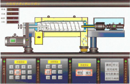 5.電控系統(tǒng)(PLC+液晶屏全自動(dòng)控制,動(dòng)態(tài)畫(huà)面顯示):由臥螺主機(jī)、進(jìn)料泵、加藥泵、稀釋水泵、PLC控制及相關(guān)電氣元件控制箱及液晶觸摸屏組成。
