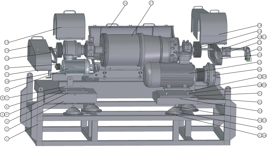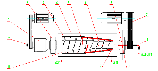 1.先檢查排渣口是否堵塞,必要時(shí)清洗排渣口; 2.更換安全銷,復(fù)位過載裝置; 3.止住轉(zhuǎn)鼓,用手來回盤動(dòng)差速器輸入皮帶輪,同時(shí)往轉(zhuǎn)鼓內(nèi)沖入清水,排出淤積的泥砂。不要強(qiáng)行單向盤動(dòng),否則可能使過載保護(hù)裝置再次脫開。直**在工作方向能盤動(dòng)50圈以上(此時(shí)螺旋推料器相對轉(zhuǎn)鼓轉(zhuǎn)動(dòng)了1圈),方可認(rèn)為排淤完畢; 4.空載啟動(dòng),確認(rèn)螺旋推料器已能正常工作。 |
