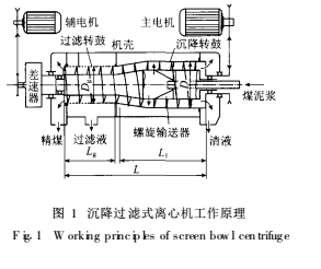 離心機是一種新型和高效的細粒煤脫水設備, 在選煤廠主要用于煤泥的脫水. 它具有產(chǎn)品水分低, 處理能力大, 占地面積小, 沒有輔助設備, 系統(tǒng)簡單和適應物料濃度變化范圍大等優(yōu)點.1 沉降過濾式