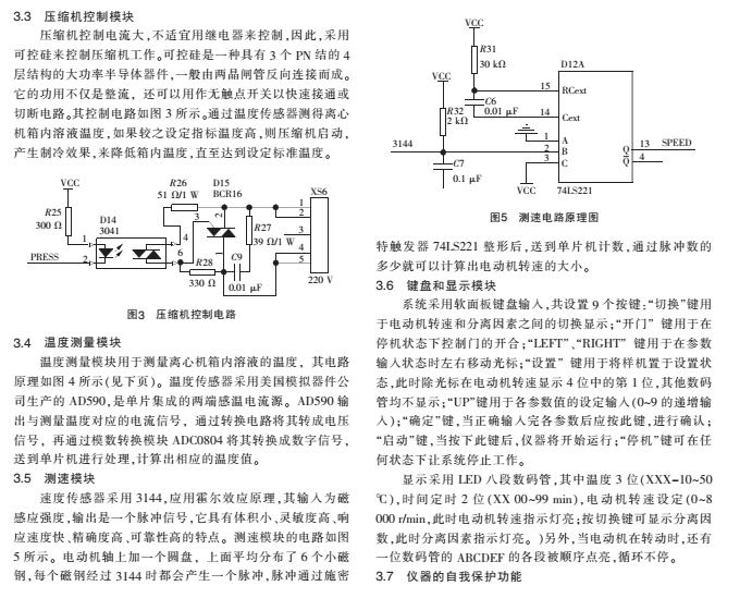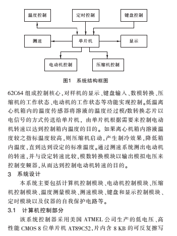 機(jī),來實(shí)現(xiàn)對電動機(jī)的轉(zhuǎn)速和溫度進(jìn)行自動調(diào)節(jié)。儀器具有上電自檢、失衡報(bào)警、蜂鳴器提示、壓縮機(jī)工作狀態(tài)指示和自動開關(guān)門等功能。 通過驗(yàn)證,儀器各項(xiàng)功能均已達(dá)到設(shè)計(jì)要求,系統(tǒng)分離效果好,振動小、噪聲低,適用于在低溫或室溫環(huán)境中將溶液中的溶質(zhì)與溶劑分離。