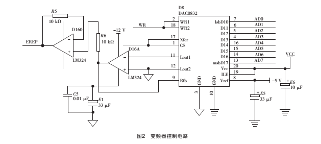 變頻技術(shù),電路原理圖如圖 2 所示。 DAC0832 的輸入端接收到來自單片機(jī) AT89C52 發(fā)來的數(shù)字信號,通過數(shù)模轉(zhuǎn)換將數(shù)字信號轉(zhuǎn)換成為模擬信號。 由于 DAC0832 的轉(zhuǎn)換輸出模擬量為電流信號,所以,在輸出端外接轉(zhuǎn)換電路,將電流信號轉(zhuǎn)換成為穩(wěn)定的電壓輸出給變頻器, 通過改變變頻器的頻率來控制電動機(jī)的轉(zhuǎn)速,直**達(dá)到預(yù)定的電動機(jī)轉(zhuǎn)速。