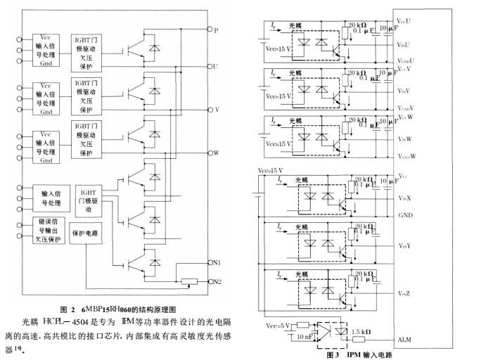 | 片, 帶有過流保護(hù)和欠壓保護(hù)的功能, 外部與 PWM信號相連, | 取 600 V, 導(dǎo)通電流取 15 A, IPM采用 6MBP15RH060。 該芯片 | ||
