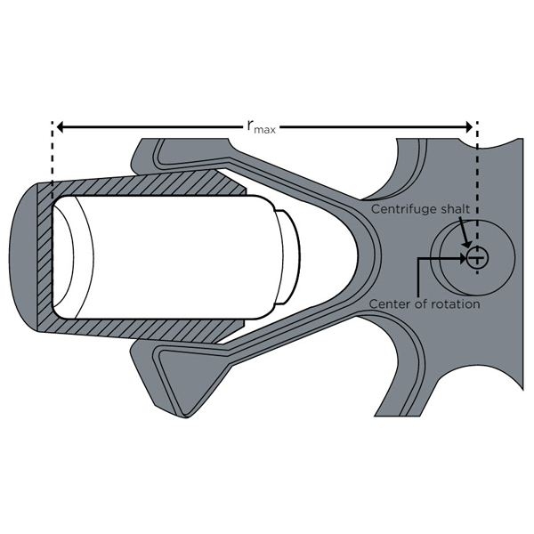 要找到轉(zhuǎn)子的zui大RCF,您需要知道其zui大速度和zui大半徑(rmax),以及離心過程中從旋轉(zhuǎn)中心到轉(zhuǎn)子腔或桶底部的距離(見下圖)。幾乎所有離心機制造商都在其說明書中為其轉(zhuǎn)子公布了這些信息。