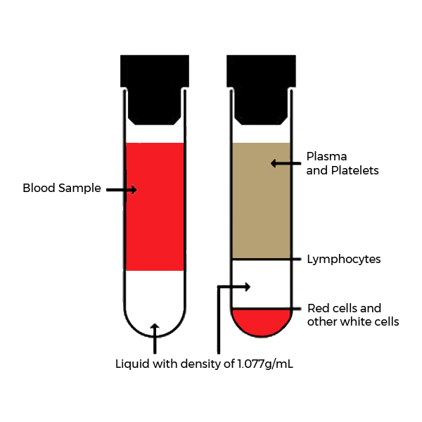 該圖顯示了淋巴細(xì)胞的密度分離。在離心之前和之后顯示管