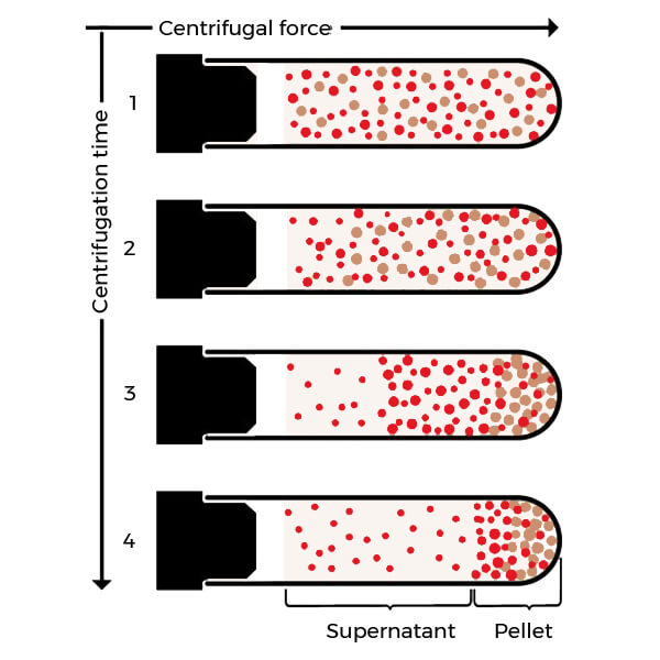 剛剛描述的過程在管子或其他容器的底部產(chǎn)生顆粒或沉淀物。顆粒上方的液體稱為上清液。從圖1中可以看出,可以從上清液中收集相當(dāng)純凈的zui小顆粒。但是顆?;蚋箢w粒將始終包含一些較小的顆粒,這些顆粒在離心開始之前靠近管底部。通過以各種速度和時間離心,可以從混合物中分離和收集不同尺寸的顆粒。該方法稱為 差速離心。