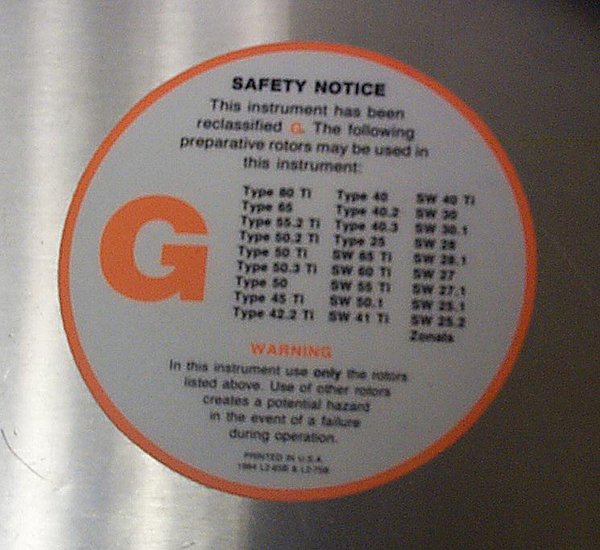 舊設(shè)備不具備所有內(nèi)置到新單位的安全功能。他們更容易體驗到轉(zhuǎn)子的失敗,它們更有可能他們失敗時,造成傷害。**關(guān)重要的是,由制造商指定的所有的安全和維護規(guī)程。基于此事件的調(diào)查,EH&S得知貝克曼L2和L3系列ultracentrifuges有特殊的操作程序和限制,以減少損失和傷害的風險。這包括滑動門指定轉(zhuǎn)子模型是安全的在一個特定的單位(圖6)使用橙色貼紙。